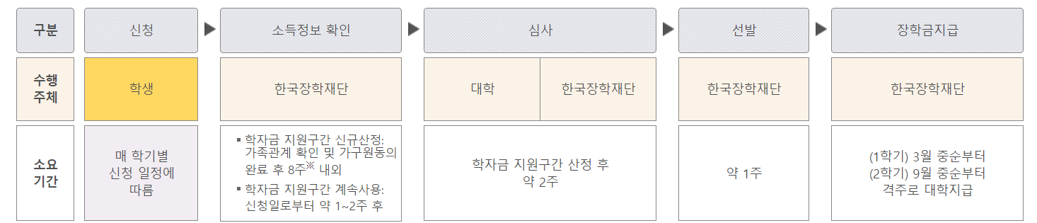 신청하는 학생들은 신청서 제출과 가구원 동의 절차를 마치면 되며 심사는 장학재단과 대학에서 하여 최종적으로 한국장학재단에서 대상자를 선발하여 통보하게 됩니다. 신청은 한국장학재단 홈페이지를 통하여 온라인으로 접수할 수 있으며 이때 공인인증서가 반드시 필요합니다. 제출 서류는 부모 생존 여부, 가족 관계에 따라 달라지므로 홈페이지에서 확인해야 합니다.