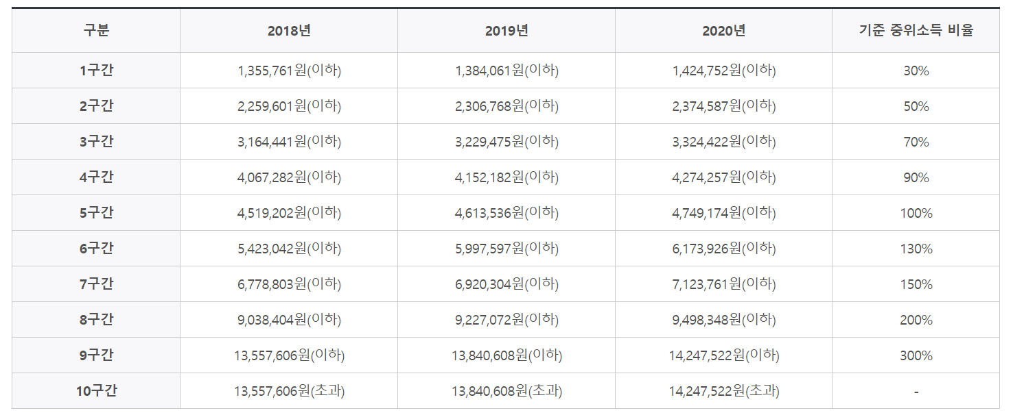 가구의 근로소득, 사업소득, 재산소득, 연금소득 등을 공제금액을 제외하고 월 기준으로 합산하고 기본재산액과 부채를 공제하고 월 소득을 환산하여 표시하게 됩니다. 이렇게 산정된 지원구간 경곗값에 따라 소득 구간별 지원 금액이 확정됩니다. 현재까지 2021년에 기준으로 삼게 될 지원구간 경곗값은 확정되지는 않았는데 추후에 공지될 예정입니다. 2020년 기준으로 보면 1구간은 기준 중위소득 비율이 30%이며 기준 금액은 월 소득 인정액 1,424,652원입니다. 2구간 월 2,374,587원, 3구간은 3,324,422원입니다.