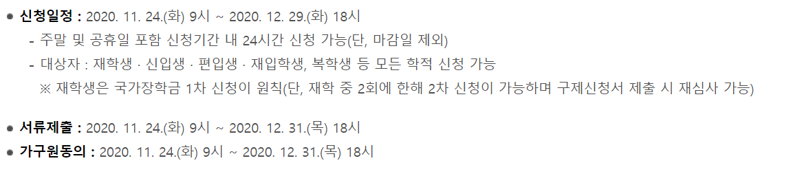 2021 국가 장학금은 1차(1학기), 2차에 걸쳐 신청을 받게 되는데 11월 24일부터 31일까지 1학기 대상 국가장학금 신청 접수가 시작되었습니다. 모든 학생들은 기간 중 신청해야 2021년 3월경에 지원을 받을 수 있게 됩니다.