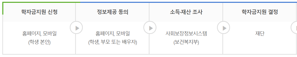 신청하는 학생들은 신청서 제출과 가구원 동의 절차를 마치면 되며 심사는 장학재단과 대학에서 하여 최종적으로 한국장학재단에서 대상자를 선발하여 통보하게 됩니다. 신청은 한국장학재단 홈페이지를 통하여 온라인으로 접수할 수 있으며 이때 공인인증서가 반드시 필요합니다. 제출 서류는 부모 생존 여부, 가족 관계에 따라 달라지므로 홈페이지에서 확인해야 합니다.