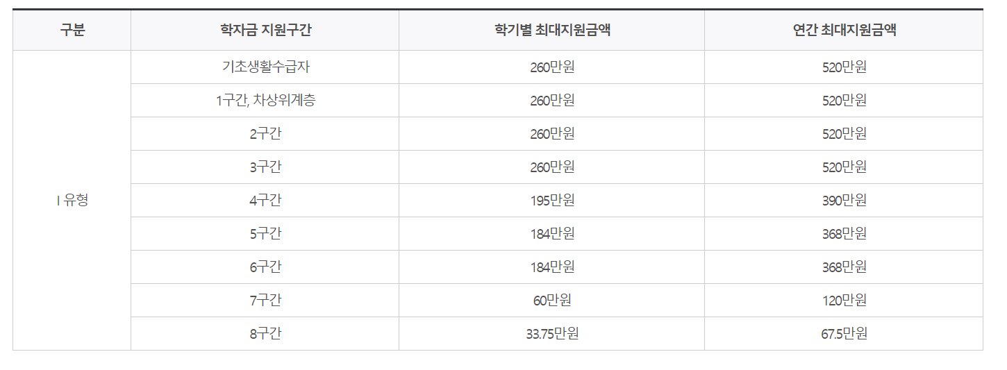 지원 금액은 자금 지원구간별로 해당 학기 등록금 필수경비(입학금, 수업료)를 초과하지 않는 범위 내에서 차등지원되는 방식입니다. 기초생활수급자와 차상위계층, 소득분위 1~3구간에 해당하는 학생들은 연간 520만원, 학기당 260만원까지 지원받을 수 있습니다. 자세한 구간별 지원 금액은 표를 확인하시기 바랍니다. 장학금은 3월 중순 이후 지급됩니다.