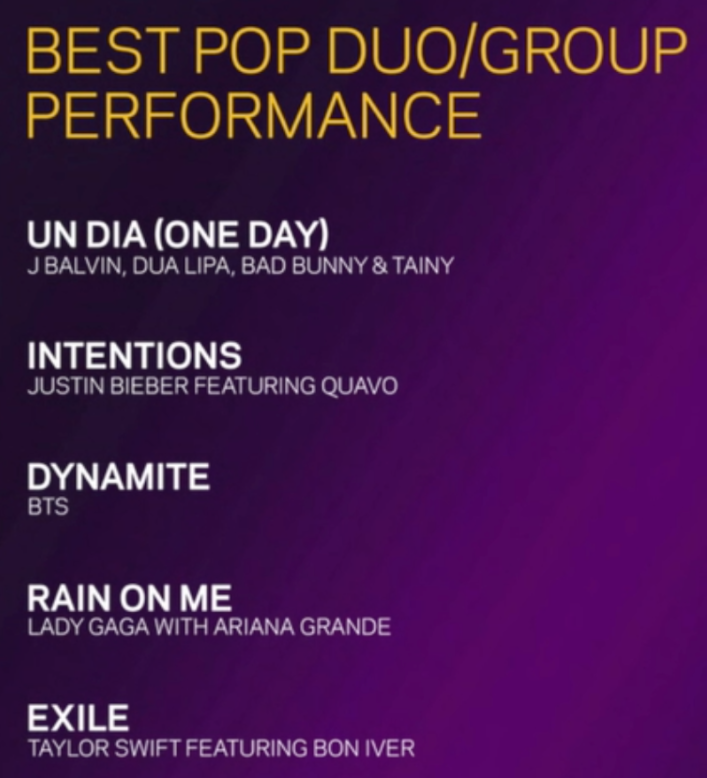 BTS와 경쟁하는 후보들도 쟁쟁한데 레이디 가가-아리아나 그란데, 테일러 스위프트-본 이베어, 제이 발빈-두아 리파-배드버니&타이니, 저스틴 비버-퀘이보 등입니다. 레이디 가가와 테일러 스위프트가 유력한 후보로 꼽히고 있습니다. 백인 우월주의가 강한 것으로 알려진 그래미상 시상식에서 이들과 경쟁하며 아시아에서 최초로 상을 받을 수 있을지 기대가 큽니다.