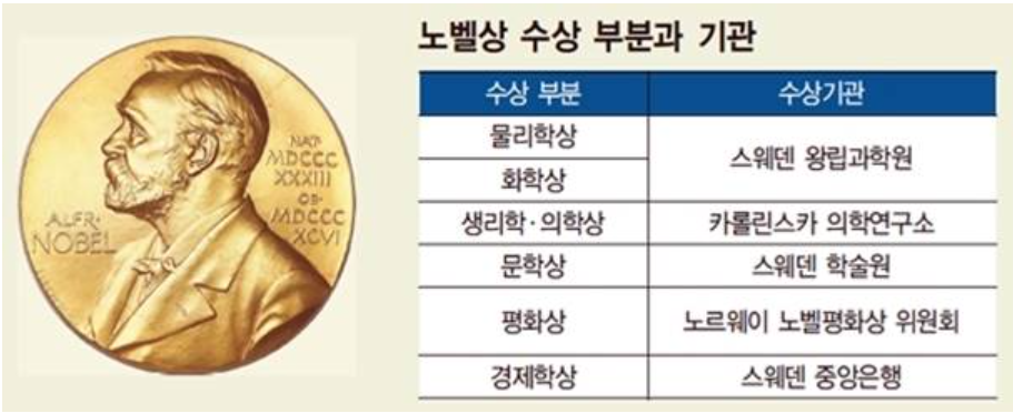 노벨상은 스웨덴의 발명가 알프레드 노벨의 유언에 의하여 설립된 상으로 북유럽 스웨덴의 왕립 과학아카데미와(물리학, 화학, 경제학) 카롤린스카의학연구소(생리학 또는 의학), 스웨덴 아카데미(문학), 그리고 노르웨이 국회가 선임하는 오슬로의 노르웨이 노벨위원회가 평화상을 선발하여 수여하고 있는 권위 있는 상입니다. 상의 종류에 따라서 수여하는 기관이 다른 것이 특징입니다.