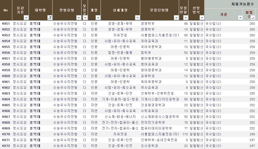 홍익대 2021 정시배치표 예상, 정시 등급컷