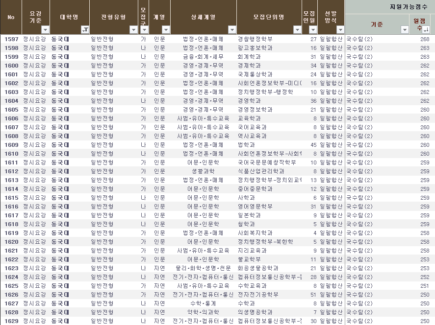 동국대 정시배치표 참고 자료를 살펴 보면 인문계는 253~268점, 자연계는 243~253점대입니다. 경찰행정 268, 경제 262, 경영 262, 정치외교 259, 영어영문 259, 화공생물공학 253, 수학 250, 산업시스템공학 249, 통계 247, 바이오환경과학 243점으로 예상됩니다.