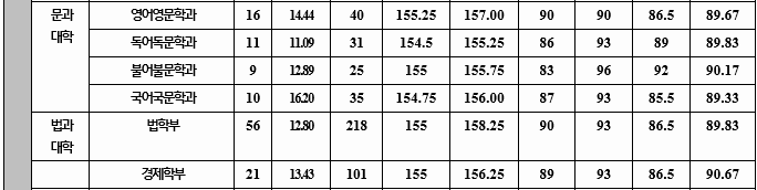 여러 기관에서 2021 정시 지원을 위한 참고표가 나와 있으며 조금씩 차이는 있지만 대략적인 내용은 거의 비슷합니다. 한군데 보다는 여러 곳을 비교하여 보는 것을 추천합니다. 여기에서는 이투스교육에서 나온 참고표를 기준으로 알아 보겠습니다. 국, 수, 탐2과목 원점수 기준입니다. 경영 267, 미디어커뮤니케이션 266, 정치외교 265, 국어국문 265, 국제무역 263, 영어교육 262, 수의예 281, 의생명공학 263, 융합생명공학 262, 컴퓨터공학 259, 식량자원과학 253점으로 예상합니다.