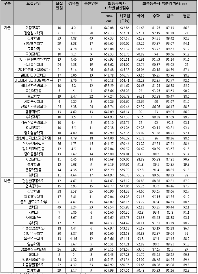 국어, 수학, 탐구 과목 평균으로 합격자 70%컷을 보겠습니다. 가군 전기전자공학 90.68, 컴퓨터공학 90.58, 국제무역 91.82, 영어교육 92.5 나군 국어국문 93.5, 문화콘텐츠 94.47, 산업공학 90.81, 정치외교 92.14, 경영 92.6, 다군 미디어커뮤니케이션 94.7, 의생명공학 92.38, 융합생명공학 91.38이었습니다. 수능등급은 2.1, 백분위 평균은 인문계 92.4, 자연계 90입니다.