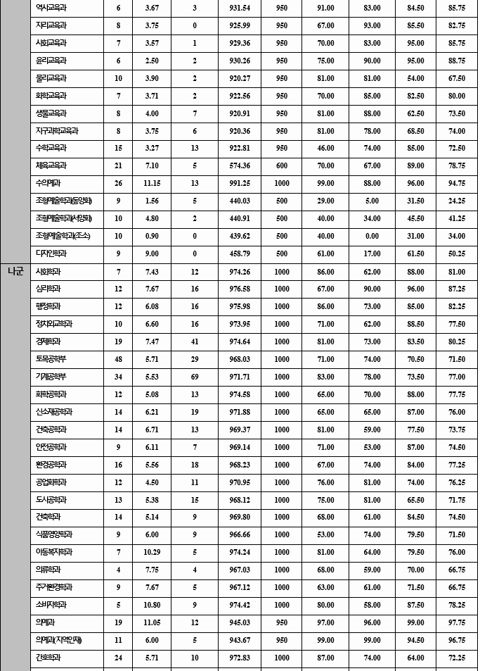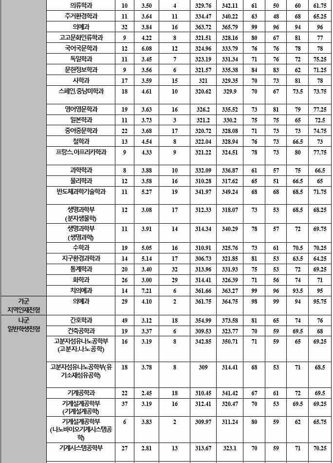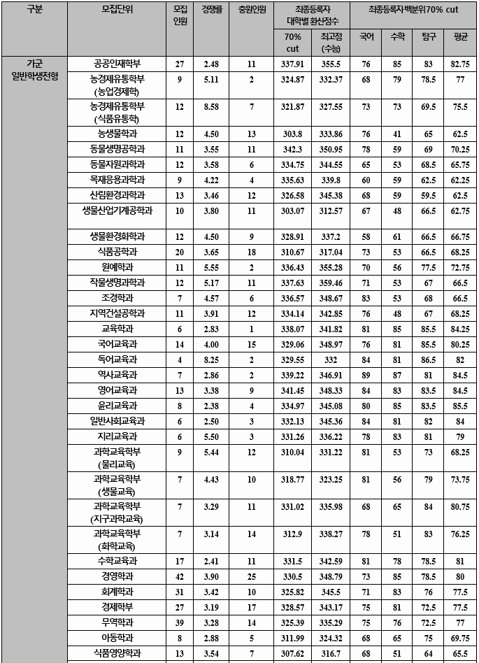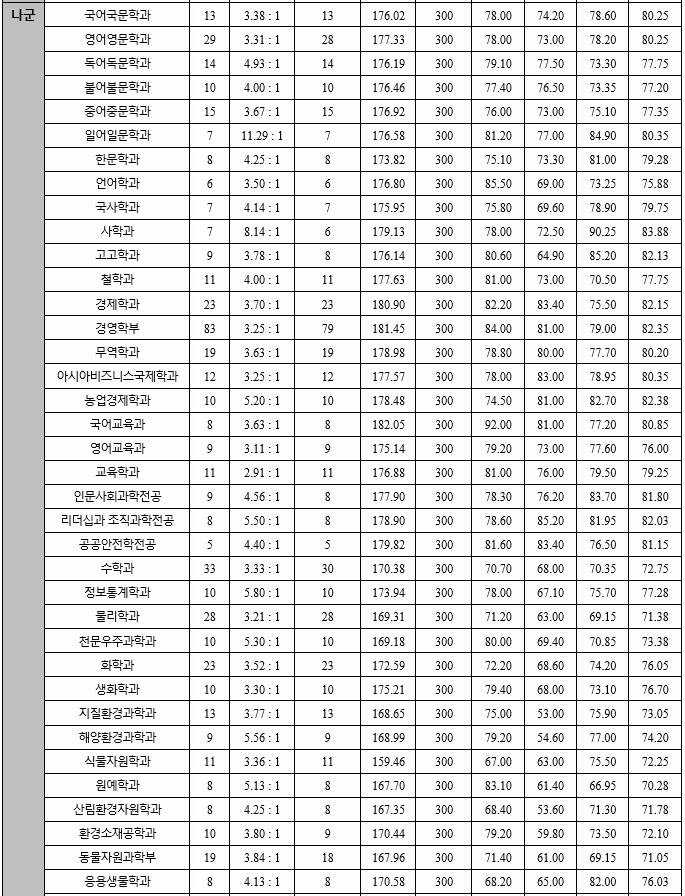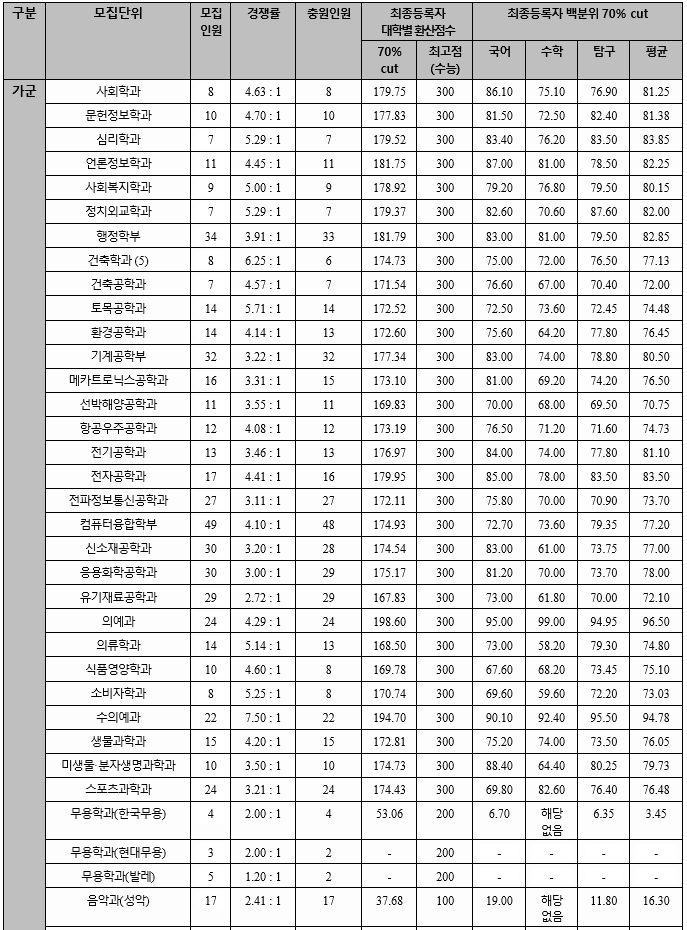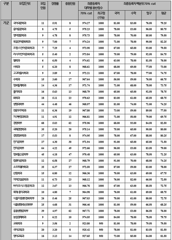 2020년도 최종합격자 국어, 수학, 탐구 과목 합격자 평균 70%컷을 보겠습니다. 가군 사회학과 81.25, 언론정보 82.25, 행정 82.85, 토목공학 74.48, 기계공학 80.50, 전자공학 83.50, 의예 96.50, 수의예 94.78, 나군 국어국문 80.25, 영어영문 80.25, 사학 83.88, 경제 82.15, 경영 82.35, 농업경제 82.38, 정보통계 77.28, 환경소재공학 72.10, 수학교육 77.75, 간호 80.95로 알려 졌습니다. 영어 등급은 인문계 가군 2.17, 나군 2.33, 자연계는 가군 2.01, 나군 2.36이었습니다.