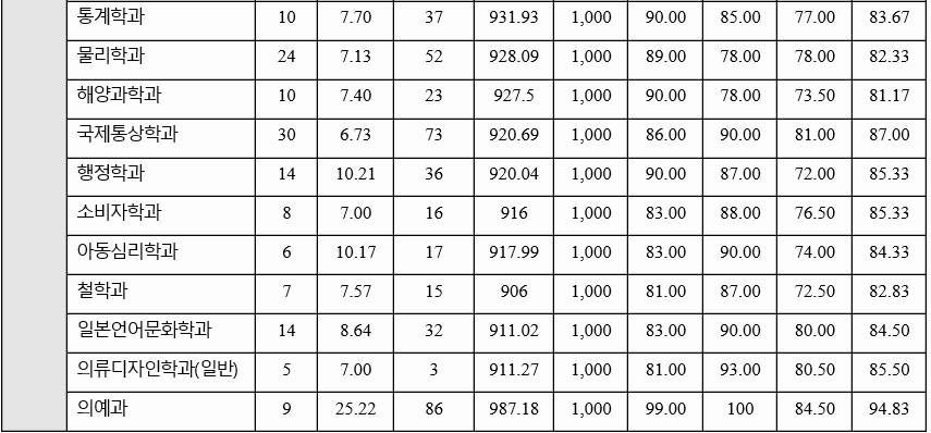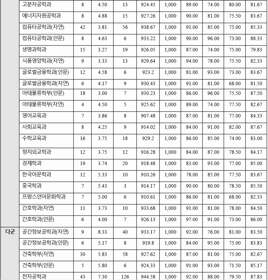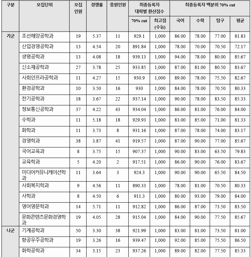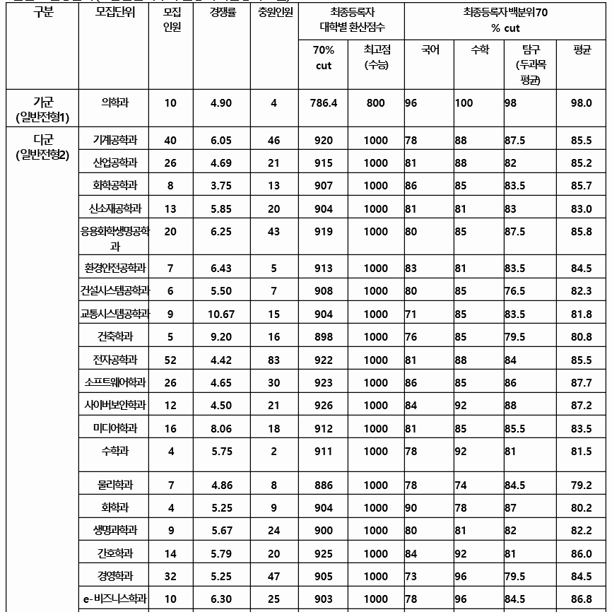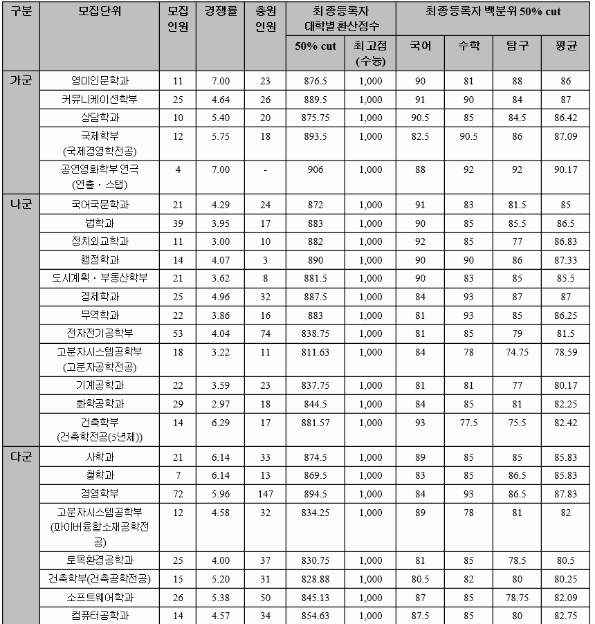 2020년 전형 결과를 살펴 보면 가군 생명공학 85.67, 신소재공학 83.67, 전기공학 85.33, 수학 81.33, 교육 83.67, 미디어커뮤니케이션 84.50, 나군 기계공학 81.00, 화학공학 85.33, 영어교육 84.33, 정치외교 84.17, 경제 85.00, 다군 건축학부 인문 85.17, 전자공학 87.83, 행정 85.33, 철학 82.83점이었습니다. 70% 컷기준 국어, 수학, 탐구 과목 평균 백분위 점수임을 참고 바랍니다. 인문계 백분위 평균은 86.8, 자연계는 85.8입니다. 수능 등급은 2.4~5 정도입니다.
