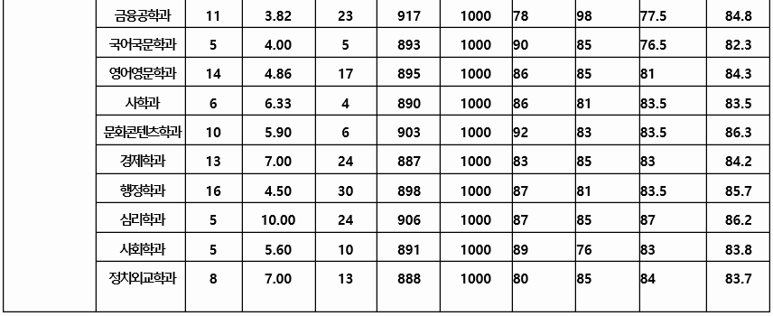 2020년도 주요 학과 전형결과를 살펴 보겠습니다. 가군 영미인문학 86, 커뮤니케이션학부 87, 국제학부 87.09, 나군 국어국문 85, 정치외교 86.83, 경제 87, 전자전기공학 81.5, 기계공학 80.17, 다군 사학 85.83, 경영학부 87.83, 소프트웨어 82.09, 컴퓨터공학 82.75, 특수교육 89.17, 체육교육 82.5점이었습니다. 인문계 평균 백분위는 88.62, 자연계는 84.0입니다. 수능 등급으로는 2.4~5입니다.