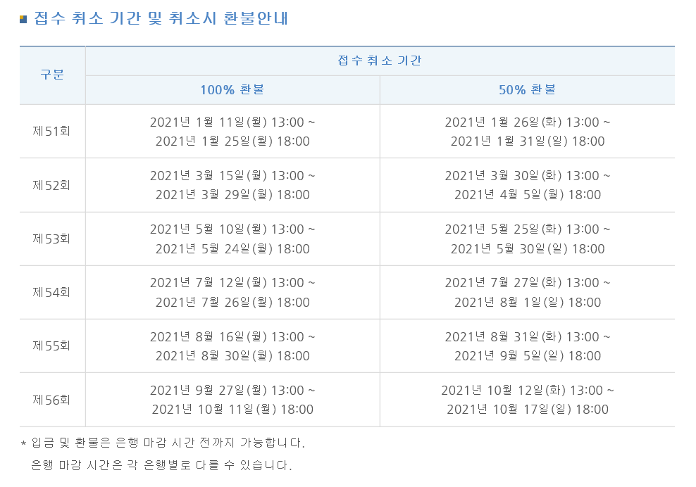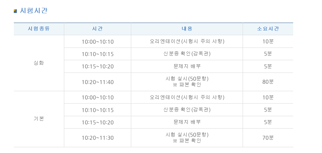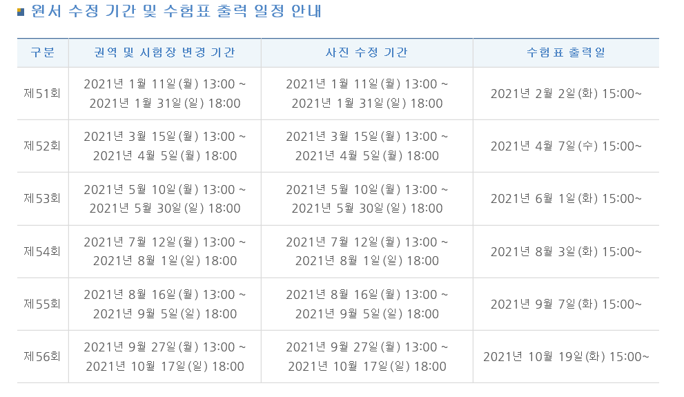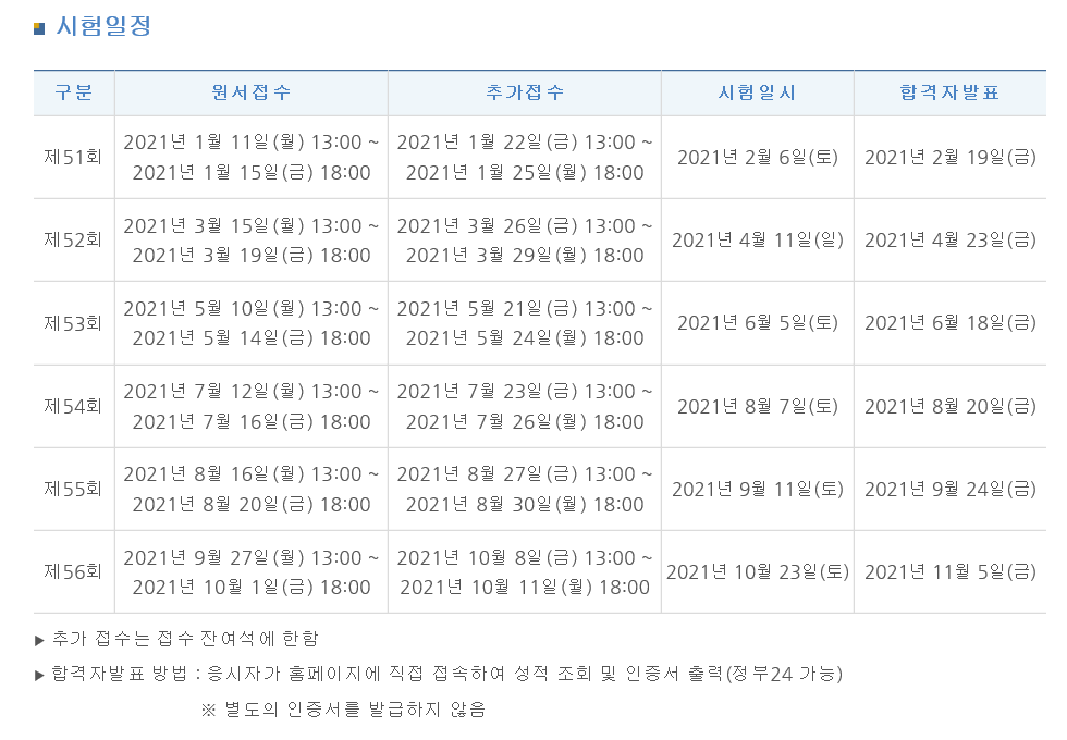 일정 별로 더 살펴 보면 52회 시험 원서 접수는 3.15~3.19, 시험일은 4.11일(일요일), 53회 5.10~5.14 원서접수, 6.5 토요일 시험, 54회 7.12~7.16 접수, 8.7 시험, 55회 시험 8.16~8.20 접수, 9.11 시험, 마지막 56회 시험은 9.27~10.1일 원서접수, 시험일은 10.23일입니다. 대부분 토요일에 치러지며 52회 시험만 일요일에 치러지게 됩니다. 53회와 56회 시험은 기본은 없고 심화 급수 시험만 시행됩니다. 응시인원 증가에 따라 1회가 증가하였으며 기본은 응시자 감소로 횟수가 줄었습니다.