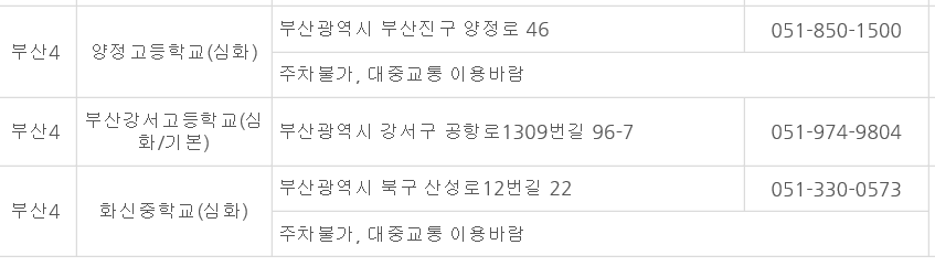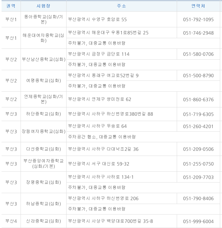 서울의 경우 강신중학교, 수명중학교, 양동중학교, 월촌, 등촌 중학교, 서울영상고등학교, 강현, 인헌, 언북, 압구정, 대왕, 언주, 청담, 서초, 천일, 성내, 명일, 송례, 문현, 인왕, 선린, 아현, 수송, 삼선, 상원, 북악, 신도봉, 온곡, 도봉, 한천, 도선, 성수, 건대부중, 상봉, 원묵, 용마, 면목, 태릉 중학교, 청담고등학교, 둔촌고등학교, 선정고등학교, 경복고등학교, 대경상고, 도선고등학교 등이 시험 장소로 지정되어 있습니다. 자세한 시도별 시험 장소는 역시 홈페이지에 있으니 참고하시면 되겠습니다.