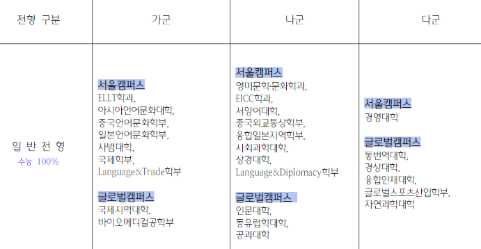 한국외대는 양 캠퍼스를 통합 캠퍼스로 운영하고 있어 글로벌 캠퍼스는 분교로 간주하지는 않습니다. 실제 중복되는 모집단위도 없습니다. 2022년도 정시모집으로 가군117명 나군242명 다군339명이며 글로벌 캠퍼스 기준입니다. 일반 전형 수능100%인 정시모집 가군에는 국제지역대학, 바이오메디컬공학부, 나군 인문대학, 동유럽과학대학, 공과대학, 다군 통번역대학,경상대학, 융합인재대학, 글로벌스포츠산업학부, 자연과학대학이 있습니다. 입학원서 접수는 12월 31일부터 1월 3일까지입니다. 최초 합격자 발표는 일반전형 2022년 2월 4일입니다. 나군 공과대학 컴퓨터공학전공이 54명으로 가장 많은 신입생을 선발합니다. 다음으로는 융합인재학부 38명입니다. 수능 반영비율은 인문계열 국어 30%, 수학 30%, 영어 20%, 탐구 20%, 자연계열 국어 20%, 수학 35%, 영어 15%, 탐구 30%입니다. 국어, 수학은 표준 점수, 영어는 등급별 환산 점수, 탐구 과목은 백분위 활용 자체 변환 표준점수를 활용합니다.