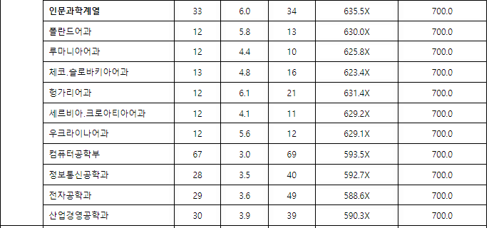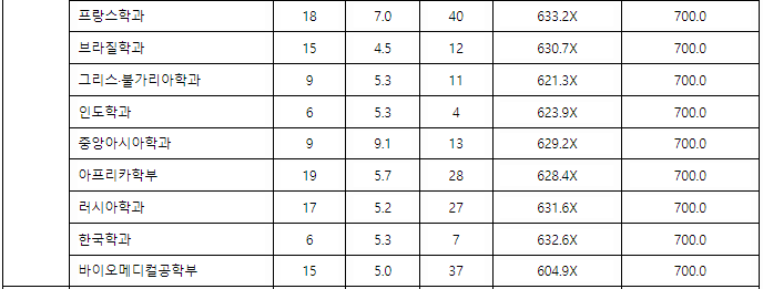2021년도 글로벌 캠퍼스 주요 모집단위 정시등급컷을 확인해 보겠습니다. 한국외국어대는 수능 배점 총합 700점 만점입니다. 대입정보포털 어디가에 공개되어 있는 정시 등급컷을 보면 700점 만점 기준 대학 자체 환산점수로 표시되어 있으며 일반적으로 보는 백분위 평균 점수는 공개되지 않았습니다.
