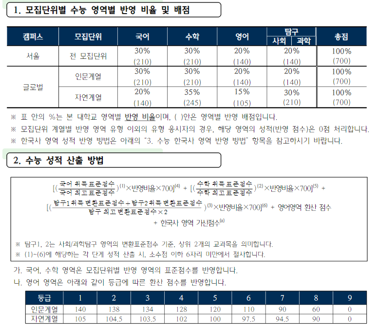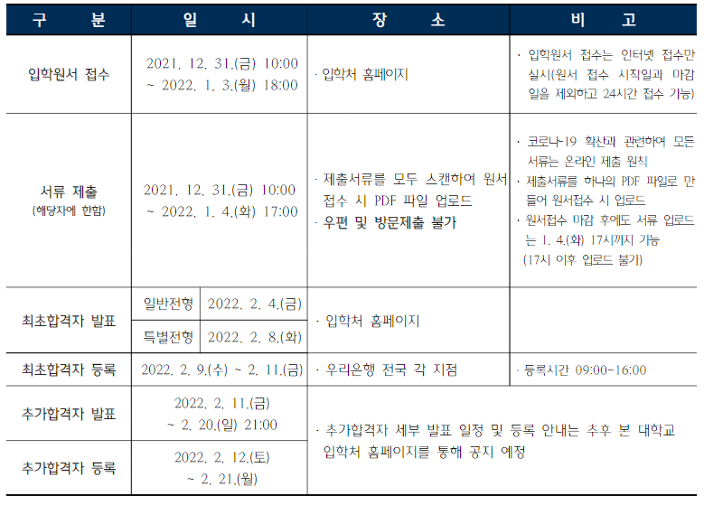 수능 시험 영역별 반영 비율은 자연계 국어 25%, 수학 40%, 탐구 35%, 예체능계 국어 40%, 수학 20~40%, 탐구 20~40%입니다. 영어는 등급별 가산점수를 부여합니다. 원서접수는 12월 30일부터 2022년 1월 3일까지이며 최초 합격자 발표일은 2.9~11일입니다.