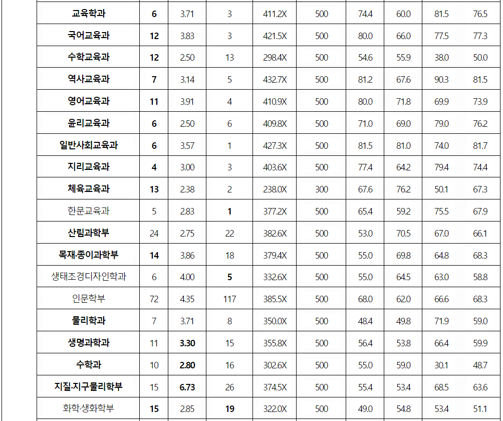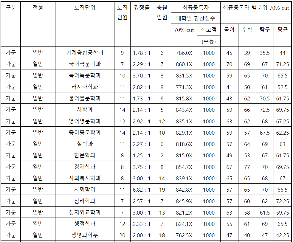 강원대 정시등급컷, 정시배치표 점수