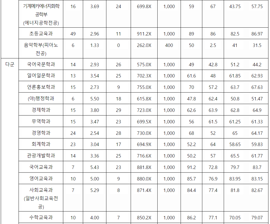 제주대 참고 배치표 점수입니다. 인문계 나군 초등교육 368, 윤리교육 340, 행정 330, 산업응용경제 329, 관광경영학과 327, 다군 국어교육 349, 영어교육 348, 사회교육 346, 경영학, 경제학 331, 회계 330, 언론홍보 328, 자연계 나군 인공지능전공 344, 바이오메디컬정보 343, 데이터사이언스 342, 기계시스템공학 339, 화학코스메틱스 338, 다군 간호 364, 생물교육전공 348, 물리교육전공 346, 생물교육전공 343, 건축학전공(5년) 342 예상입니다.