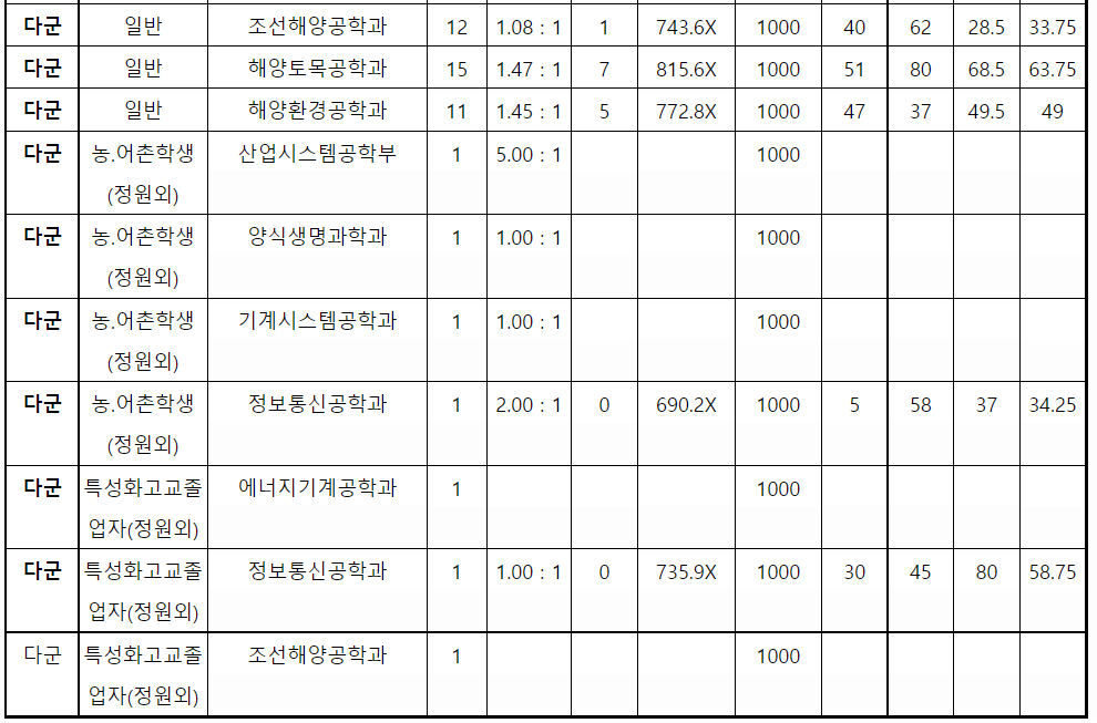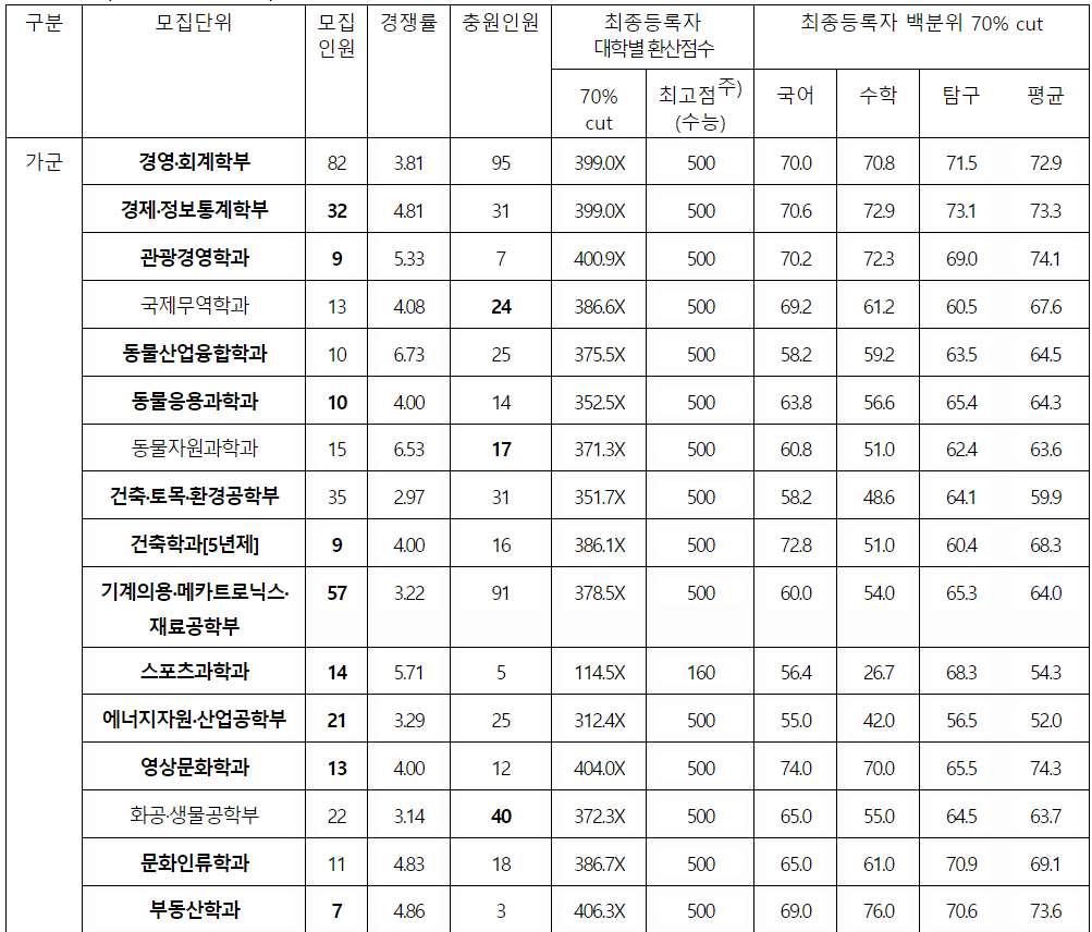 제주대 정시등급컷, 정시배치표 점수