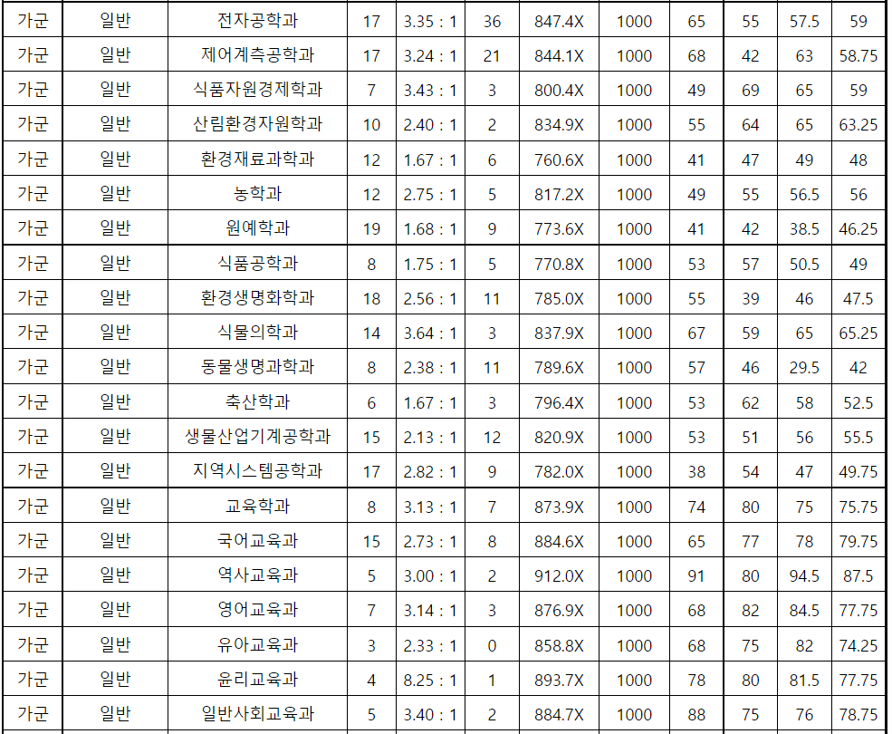 강원대 정시등급컷, 정시배치표 점수