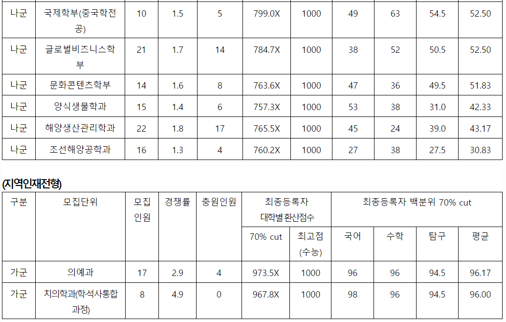 전남대 정시 모집, 등급컷, 정시배치표 지원 점수
