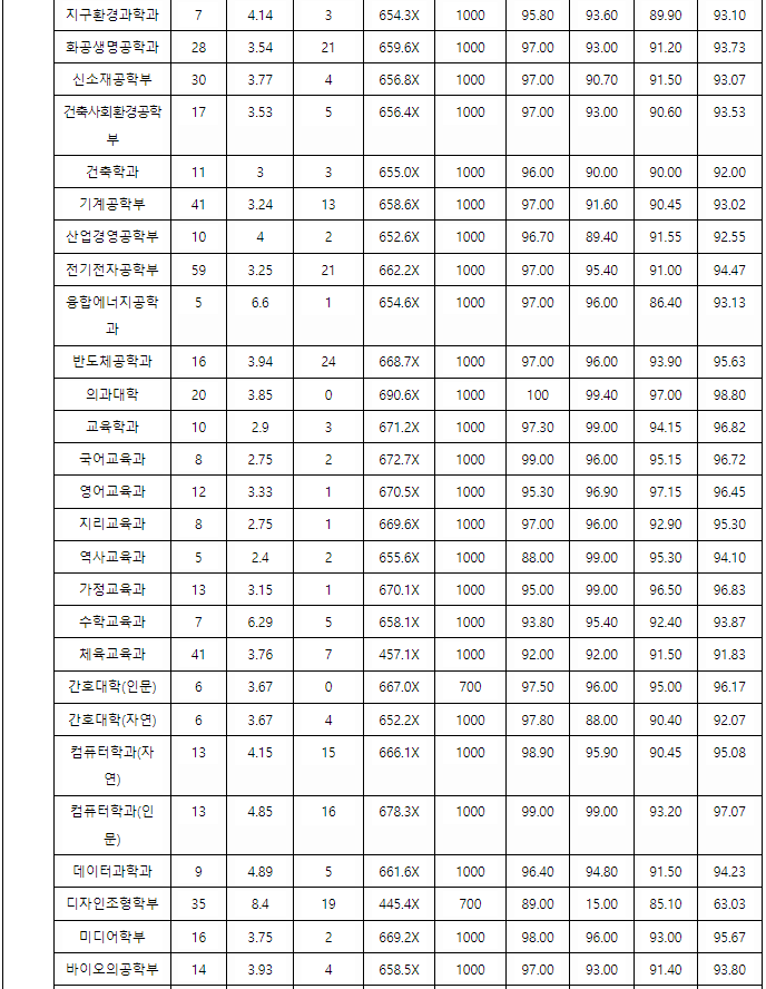2021년도 최종합격자 70% 백분위 등급 컷입니다. 경영대학 97.33, 경제 95.87, 정치외교 96.60, 행정 96.87, 교육 96.82, 국어교육 96.72, 수학교육 93.87, 미디어학부 95.67, 국어국문 95.78, 사학 95.12, 자연계 의과대학 98.80, 간호대학 92.07, 컴퓨터학과 95.08, 식품자원경제 95.43, 화공생명공학 93.73, 기계공학 93.02, 전기전자공학 94.47이었습니다.