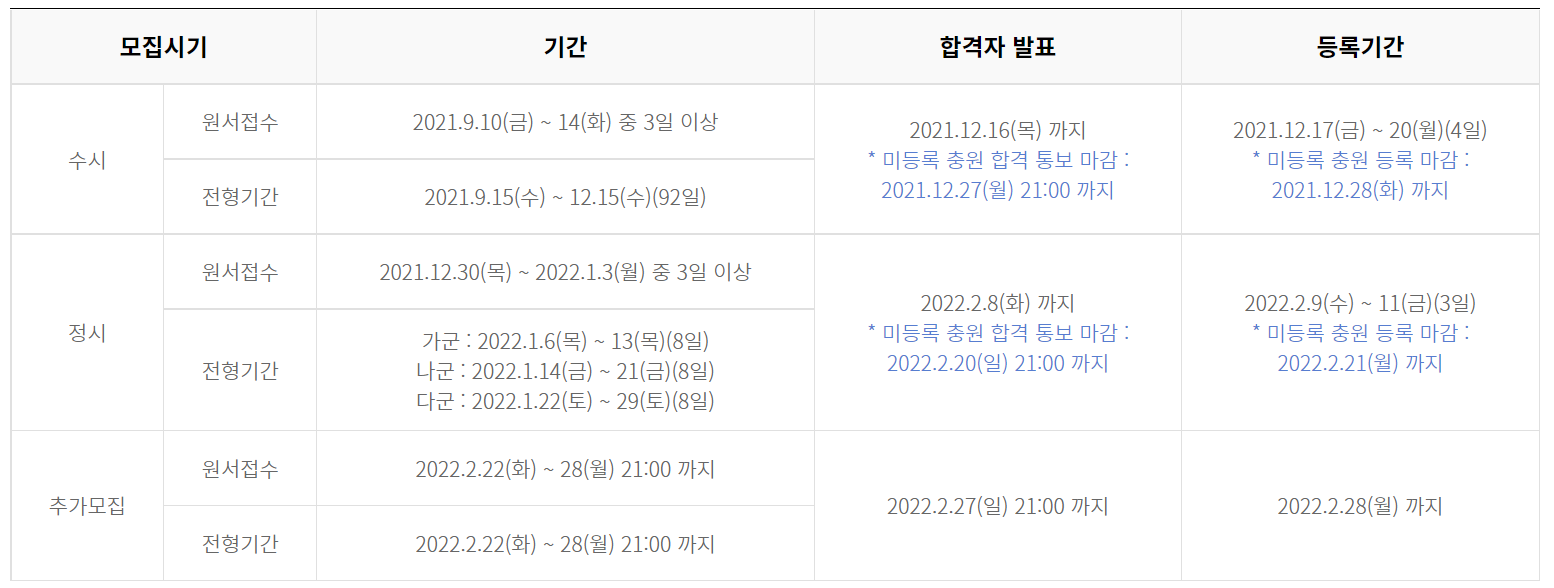 금주에는 2022학년도 수능시험 성적이 발표되고 곧이어 다음주에는 대부분의 대학이 수시모집 합격자를 발표하며 본격적인 대입 일정이 진행됩니다. 수능 성적표를 받아들게 되면 수시 모집에서 수능 최저학력 기준이 있는 대학, 학과 진학 가부 여부를 알 수 있게 되는데 이번에는 미충족 비율이 다소 증가할 것으로 예상하고 있습니다. 이에 따라 수시에서 이월되는 정시 모집 인원도 늘어날 것으로 내다 보고 있습니다. 수능 성적에 따라 작성될 대학별 정시배치표는 발표전에 나와 있는 배치기준표보다는 정확도가 올라갈 것으로 보입니다. 정시 모집 원서접수는 대학별로 12월 30일부터 2022년 1월 3일까지 진행됩니다.