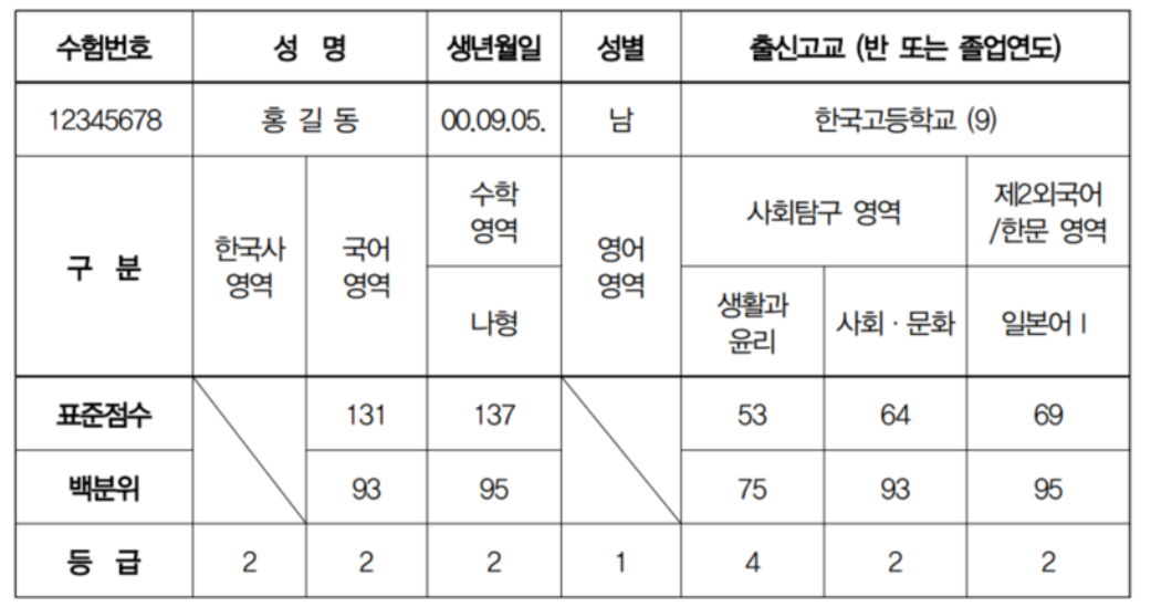 수능 성적표 예시