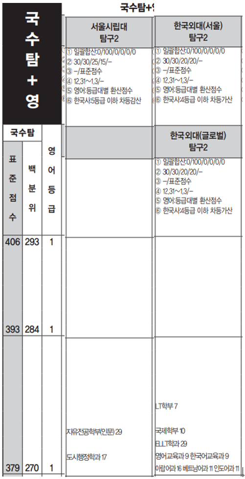 한국외국어대, 서울시립대 정시등급컷, 정시배치표 지원 가능점수