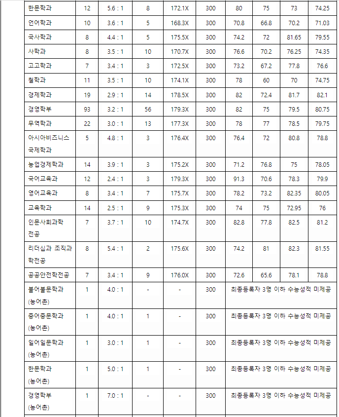 2022년도 정시배치표 참고 점수입니다. 표준 점수 기준입니다. 인문계 가군 경영 352, 경제 351, 무역 349, 농업경제 346, 국제학, 영어영문 345, 국어국문, 국사학 344, 나군 국어교육 358, 영어교육 357, 행정학부 352, 언론정보학과 350, 자연계 가군 수의예 398, 수학 360, 간호 369, 정보통계학 361, 물리학 360, 응용생물학 359, 동물자원과학 356, 나군 수학교육 374, 전자공학 375, 기술교육 373, 전기공학 370, 기계공학 369, 인공지능 367점으로 예상합니다.