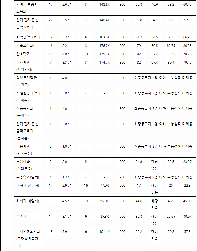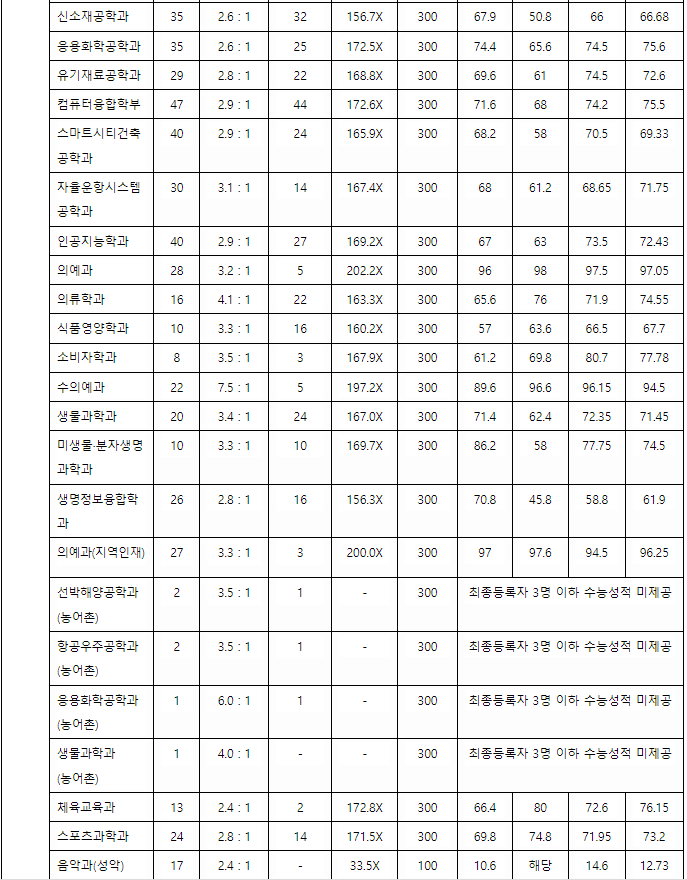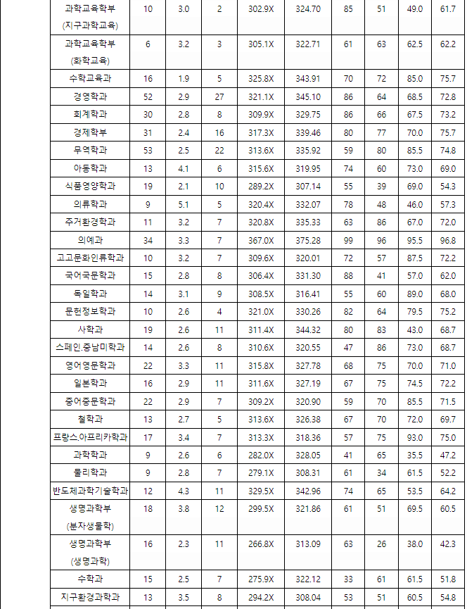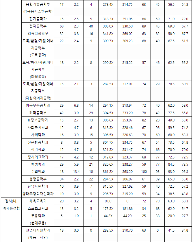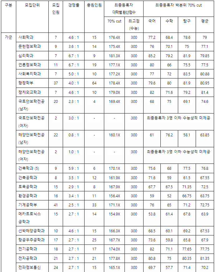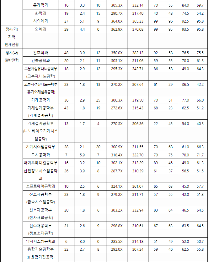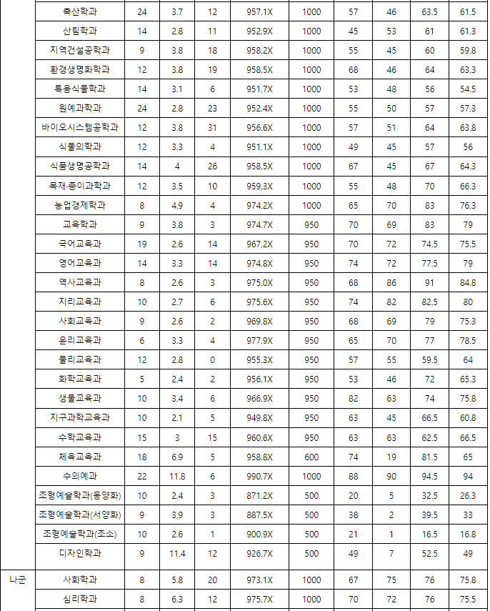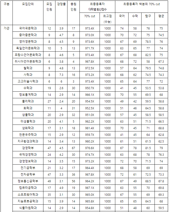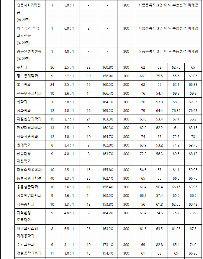 충남대 정시등급컷, 정시배치표 점수