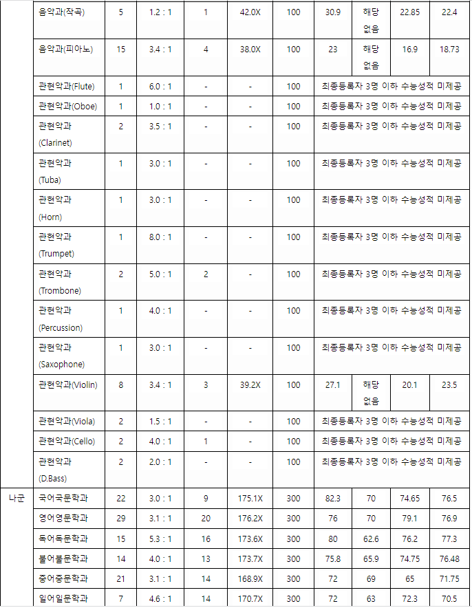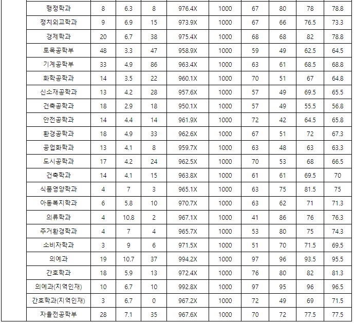 정시배치표 참고 지원 점수입니다. 인문계 가군 영어교육 357, 국어교육 356, 역사교육 354, 공공인재 349, 일반사회교육 348, 윤리교육 347, 지리교육 346, 교육 345, 경영, 회계 344, 경제, 무역 343, 농업경제,영어영문,국어국문,프랑스아프리카학 342, 나군 행정 343, 정치외교 342, 신문방송, 사회복지 341, 사회 339, 자연계 가군 수학교육 369, 과학교육(생물) 361, 통계 355, 물리학, 수학 348, 분자생물 347, 나군 수의예 400, 기계공학 356, 기계시스템공학 355, 기계설계공학 351, 간호 367, 화학공학 355, 전기공학 354, 컴퓨터공학 353, 전자공학 352, IT응용시스템공, IT지능정보공, IT융합기전공 350점으로 예상합니다.