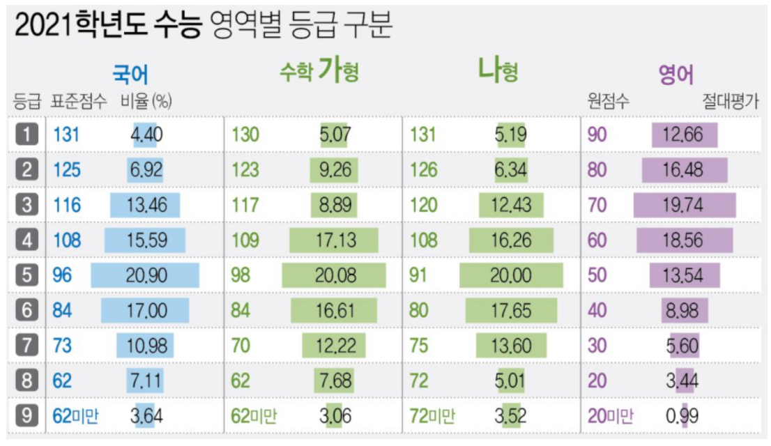 2021년도 수능 확정 등급컷 점수대는 어땠는지 확인해 보겠습니다. 2021년도 수능 시험은 국어와 수학 가형이 2020년도 시험과 비교하면 어려워졌고 수학 나형은 쉬웠던 것으로 평가됩니다. 절대 평가 과목인 영어 과목은 1등급의 비율이 무려 12.66%나 되어 변별력이 떨어진 것으로 보입니다.