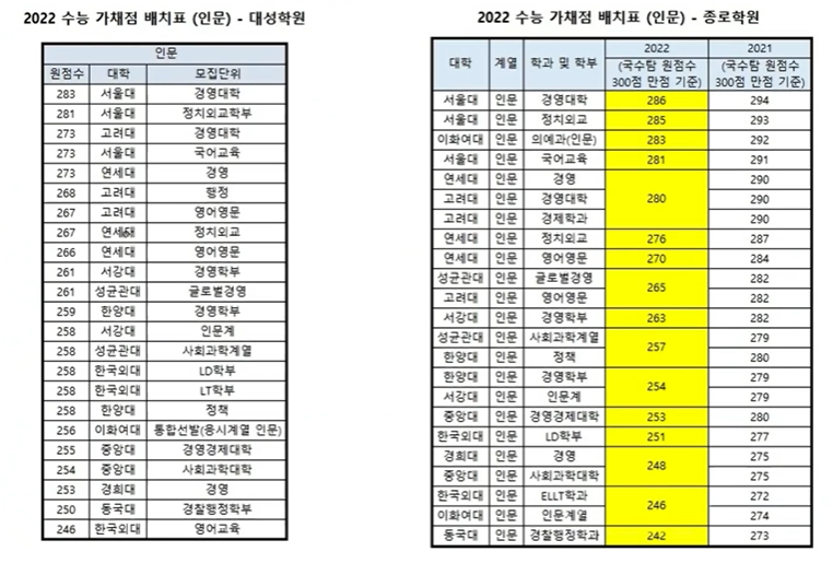 2022년도 정시 등급별 대학, 정시 가나다군 대학, 원점수 정시배치표 지원 가능 대학 예상 점수