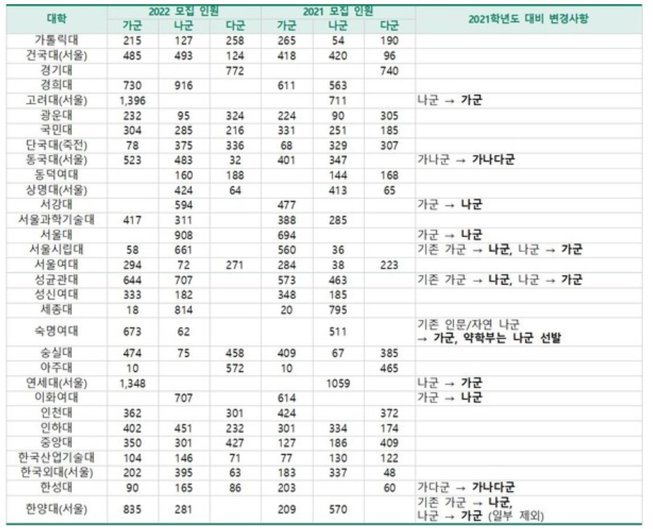 가나다군으로 모집을 구분하는 정시 모집은 그 틀이 바뀌지 않고 유지되고 있는 전형 방식입니다. 큰 틀은 유지되지만 대학 별로 모집 군이 변경되고 있으니 잘 살펴 봐야 합니다. 2022년도 정시 모집군에서도 역시 중요한 변화가 있었습니다.
