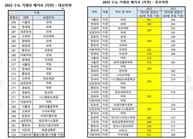 2022년도 정시 등급별 대학, 정시 가나다군 대학, 원점수 정시배치표 지원 가능 대학 예상 점수