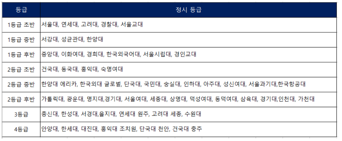 2021~2022 정시 등급별 대학 예상