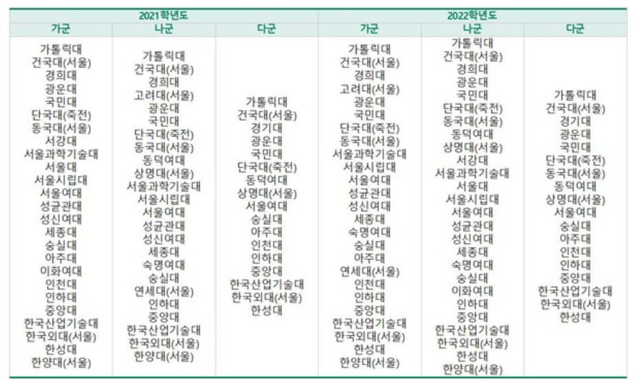 2022년도 정시 가나다군 대학