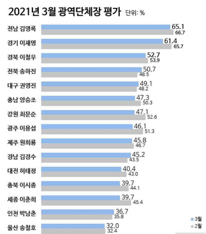 평가 결과가 좋다고 해서 재선을 보장하는 것은 아니지만 가능성은 충분히 있을 것입니다. 물론 광역단체장 평가를 기반으로 더큰 선거에 도전해 볼 수도 있을 것인데 현재 광역단체장 중 대선 후보로 거론되는 인물중 이재명 지사는 단연 앞서가고 있습니다. 원희룡 제주지사, 김경수 경남지사 등도 꾸준히 거론되고 있는 광역단체장들입니다. 이번에 다시 서울시장에 당선된 오세훈 서울 시장도 대선 주자급이지만 일단 내년 지방선거에 연임에 도전하고 차차기를 노릴 것으로 예상됩니다. 2022 지방선거 레이스도 이제 본격적으로 시작될 것으로 보입니다.