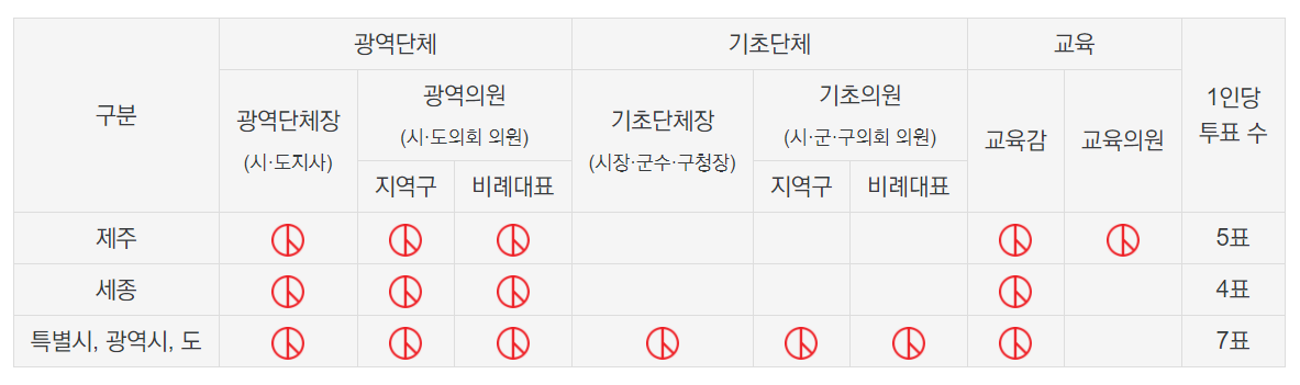 전국에서 한날 동시에 투표를 하는 선거라서 전국동시지방선거로 부르고 있으며 지방자치단체장 선거일로도 부릅니다. 투표권은 만 18세 이상이면 투표를 할 수 있으며 거주하는 지역의 자치단체장부터 기초의원까지 7명을 선출하게 됩니다. 2004년 6월 2일생까지 투표에 참여할 수 있습니다. 지방선거는 뽑는 사람이 많다보니 기표 용지가 다른 선거와 비교하면 많이 복잡한 편입니다. 광역단체장 외에는 사실 내가 잘 아는 후보가 없다보니 소속 정당을 보고 투표를 하는 경우가 많은 선거인데 기초단체장이나 기초의원의 역할도 적지 않기 때문에 현명한 선택이 필요합니다. 일부 지방의원들의 일탈 행위도 심심치 않게 언론에 보도되며 무용론도 끊임없이 나오고 있지만 그래도 기초적인 민주주의를 지키기 위한 장치인만큼 감시와 견제를 통하여 그들이 제대로 일을 할 수 있도록 하는 것이 중요하겠습니다.