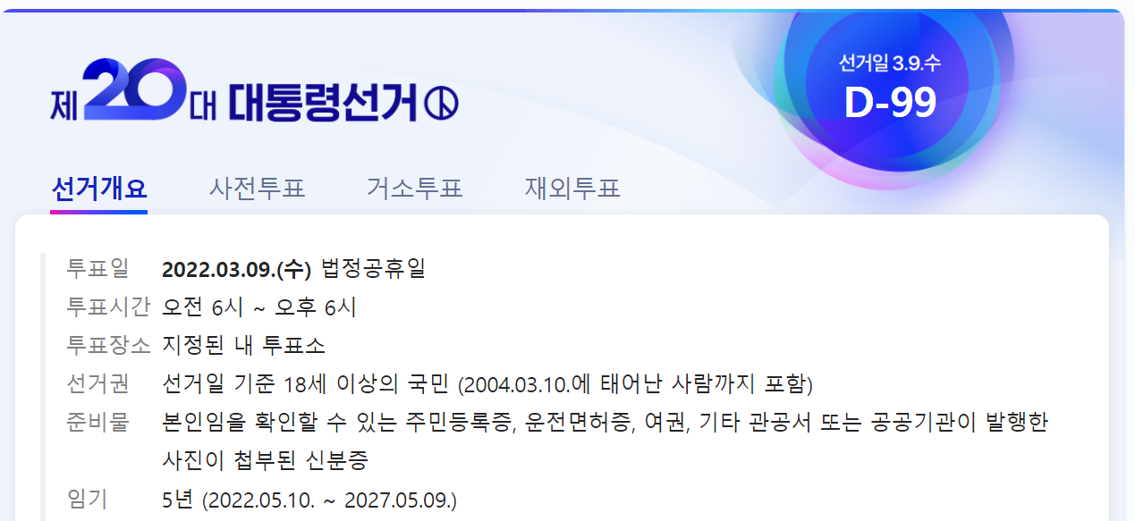 이상과 같이 99일 남아 있는 2022년 20대 대통령 선거 일정에 대하여 알아 보았습니다. 정권 유지가 될지 교체가 될지 2022년 3월 9일이면 알 수 있을 것입니다. 이미 대선 경쟁은 시작되었으니 관심있게 일정을 확인하시고 투표에 적극 참여하시기 바라겠습니다.