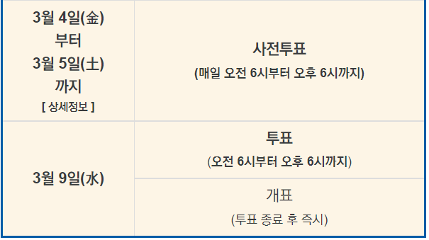 최근 선거에서 많은 유권자들이 참여하고 있는 사전투표일은 2일간으로 2022년 3월 4일부터 5일까지이며 시간은 매일 오전 6시부터 오후 6시까지입니다. 이때는 본인 거주지와 관계없이 투표를 할 수 있습니다. 2022년 3월 9일 오전 6시부터 오후 6시까지 대선 투표가 진행되고 나면 바로 개표가 진행되어 당일 저녁 10시경이면 대략적인 당선자가 결정될 것으로 예상합니다. 이번에도 출구 조사가 있을 것으로 보이는데 얼마나 근접하게 승부를 예측하게될 지도 관심사입니다.