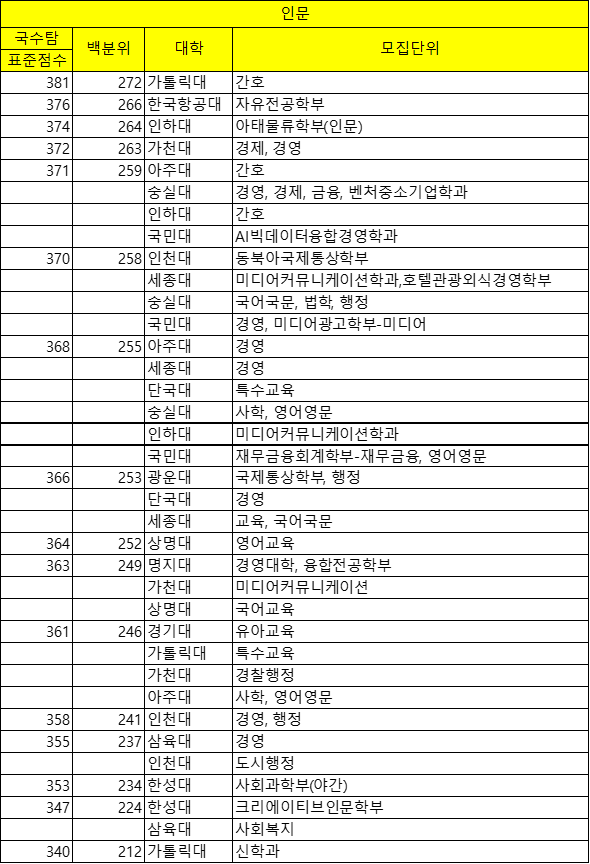 인문계열에서는 가톨릭대 간호학과가 표준점수 381, 백분위 272로 예상되어 가장 높은 점수대입니다. 가톨릭대는 표준점수와 백분위를 함께 반영합니다. 한국항공대 자유전공학부 표준점수 376점, 인하대 아태물류학부는 374점으로 예상합니다. 가천대 경제 경영 372점, 아주대 간호, 국민대 AI빅데이터융합경영학과 371점, 숭실대 사학 368점, 세종대 미디어커뮤니케이션 370점 등입니다. 지원 가능 예상 점수대는 표를 참고하시기 바랍니다.