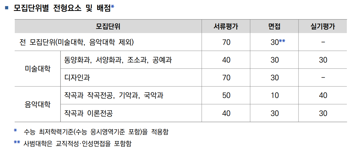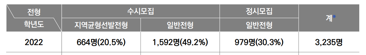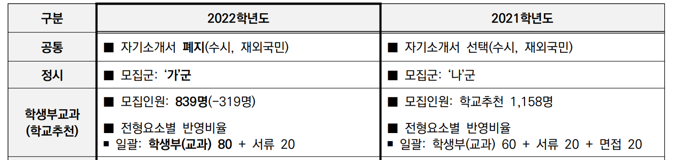 2022학년도 모집 인원은 839명으로 지난해 1183명보다 감소하였습니다. 반영 비율은 교과 80%, 서류 20%로 내신 성적의 비율이 대단히 높습니다. 역시 일반고 학생들이 많이 지원하는 전형입니다. N수생도 지원 가능합니다. 수능 최저 학력기준이 있으며 인문계는 국어, 수학, 영어, 탐구 3개 영역 등급합 5이내 한국사 3등급 이내이며 자연계는 국수영탐 3개영역 등급합 6, 한국사4등급 이내입니다. 면접은 실시하지 않습니다.