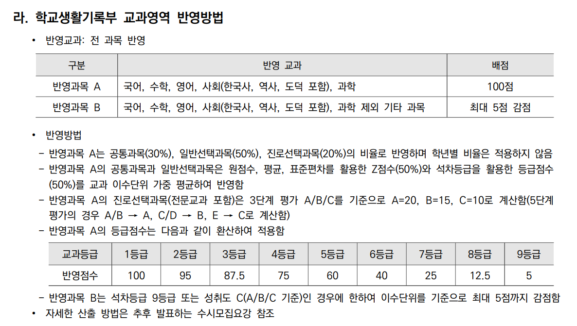대상은 국내 고등학교 3학년 재학생이며 2022년 2월 졸업예정이면서 학교장의 추천을 받은 학생입니다. 고등학교별 추천인원은 고등학교 3학년 재학인원의 5%이내입니다. 연세대 학교장 추천 전형은 수능최저학력기준은 없으며 면접이 있습니다. 1단계 교과 100%로 5배수를 선발하고 2단계에서 1단계평가 60%, 면접 40%의 비율로 신입생을 선발합니다. 면접의 비중이 상당히 높은 편으로 준비가 필요합니다. N수생, 검정고시 출신은 지원이 불가합니다. 교과목 반영 항목을 보면 국어, 영어, 수학, 사회, 과학 등 주요과목은 반영과목A이며 기타 과목은 반영과목B로 분류합니다. 반영과목A는 다시 공통과목 30%, 일반선택과목 50%, 진로선택과목 20%비율로 반영합니다. 반영과목A는 70점, 반영과목B는 30점으로 반영하며 반영과목B는 9등급인 경우 최대 5점까지 감점하게 됩니다.