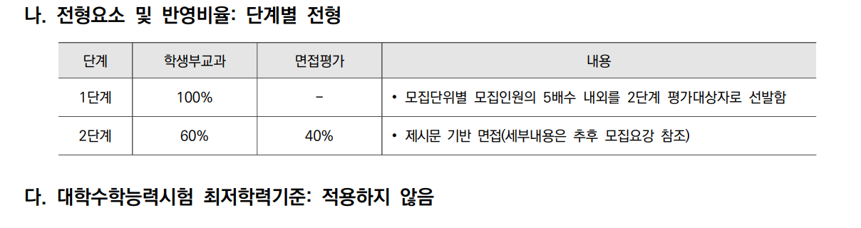 2022학년도 모집 인원은 839명으로 지난해 1183명보다 감소하였습니다. 반영 비율은 교과 80%, 서류 20%로 내신 성적의 비율이 대단히 높습니다. 역시 일반고 학생들이 많이 지원하는 전형입니다. N수생도 지원 가능합니다. 수능 최저 학력기준이 있으며 인문계는 국어, 수학, 영어, 탐구 3개 영역 등급합 5이내 한국사 3등급 이내이며 자연계는 국수영탐 3개영역 등급합 6, 한국사4등급 이내입니다. 면접은 실시하지 않습니다.