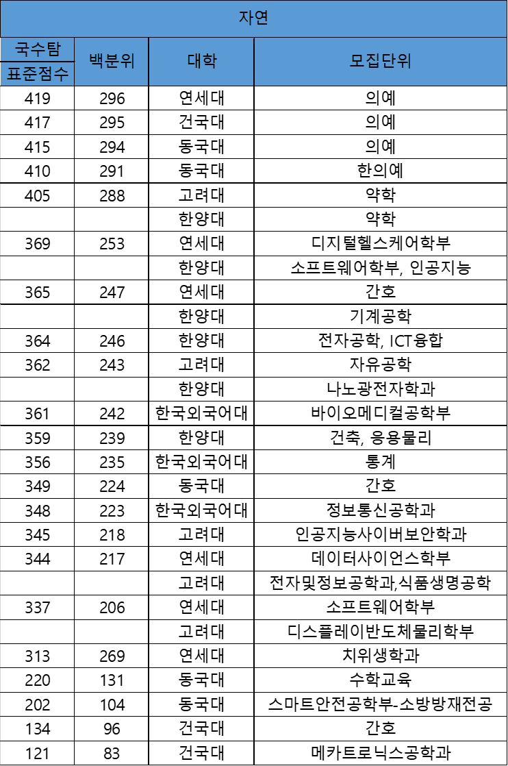 자연계열의 의예, 약학과는 모두 강세로 표준점수 405점 이상이 필요합니다. 연세대 미래캠퍼스 의예과는 표준점수 419점, 백분위 296이 필요할 것으로 예상됩니다. 고려대, 한양대 약학과는 표점 405, 백분위 288로 지원 가능점수대를 예측합니다. 연세대 디지털헬스케어 369, 253, 한양대 소프트웨어학부, 인공지능 369, 253, 고려대 자유공학 362, 243, 한국외국어대 바이오메디컬공학부 361, 242, 동국대 간호 349, 224, 한양대 건축 359, 239로 예상합니다.
