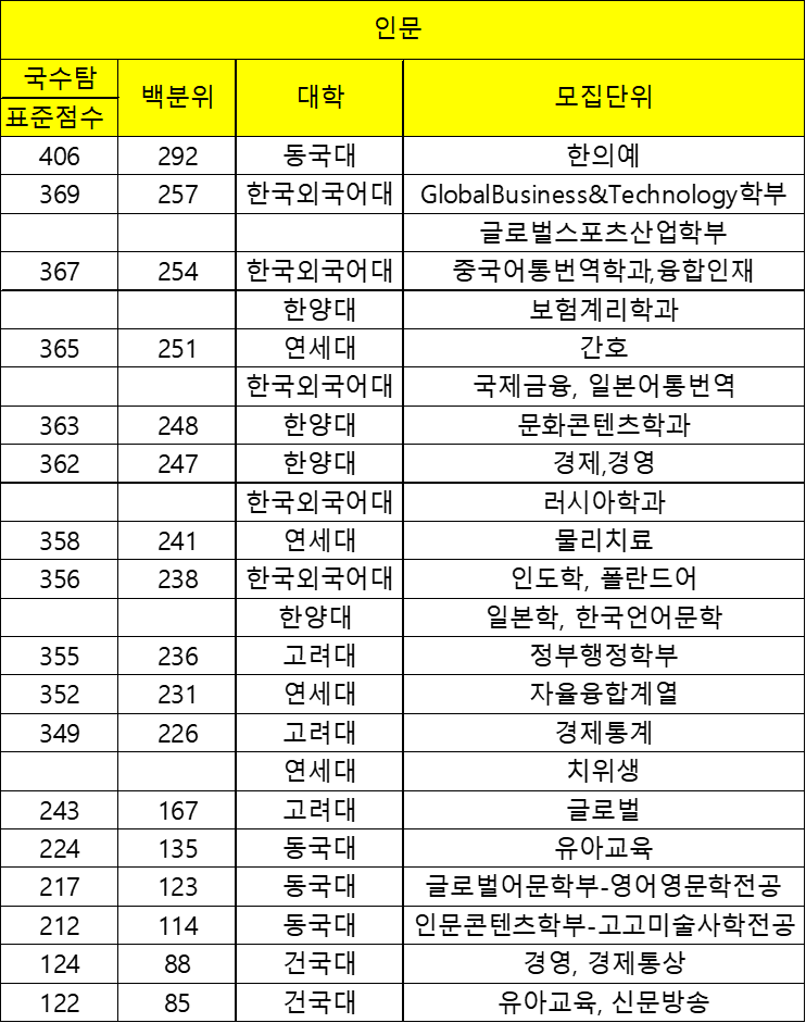 인문계열에서는 동국대 한의대가 가장 높은 표준점수 406점, 백분위 292입니다. 동국대는 표준점수만 반영합니다. 주요 상위권 학과를 보면 한국외국어대 GlobalBusiness&Technology학부 369점, 백분위 257, 한양대 보험계리 367, 254, 연세대 간호 365, 251, 한국외국어대 국제금융 365, 251, 고려대 정부행정 355, 236, 연세대 자율융합계열 352, 231, 동국대 유아교육 224, 135, 건국대 경영 124, 88 등입니다.