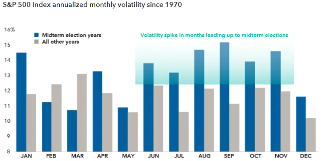 중간 선거 이후 금융 시장에도 큰 영향을 줄 것으로 예상됩니다. 현재까지 중간 선거는 월스트리트에서 중요한 역할을 하지 않았습니다. 투자자들은 현재 연방 준비 제도 이사회의 통화 정책 변화에 주로 우려하고 있습니다. 지난 선거 주기를 살펴보면 중간 선거 연도에 미국 주식 시장이 다른 연도와 다르게 행동했음을 알 수 있습니다. 따라서 의회 선거가 시장에서 이미 상승하고 있는 변동성을 다시 한 번 부추길 가능성이 매우 높습니다. S&P 500 지수의 변동성은 중간 선거 연도에 평균 16%(1970년 이후 데이터 기준)였으므로 다른 연도(13%)보다 높습니다. 더욱이 블루칩 지수는 중간선거 직전 몇 개월 동안 거의 변동이 없었습니다. 선거 결과에 대한 불확실성이 줄어들고 S&P 500 지수가 상승하기 시작한 것은 여론 조사가 있기 불과 몇 주 전이었습니다. 중간 선거 이후에는 주식 시장이 랠리로 전환될 가능성이 커질 것으로 예상합니다. 1950년 이후 S&P 500 지수는 선거 후 12개월 동안 평균 +15%를 기록했습니다. 이는 다른 모든 연도(7.1%)의 두 배 이상입니다. 아마도 주가는 상승할 것으로 예상됩니다.