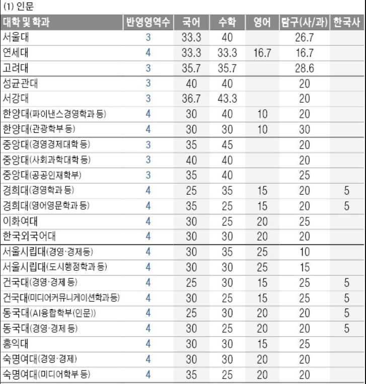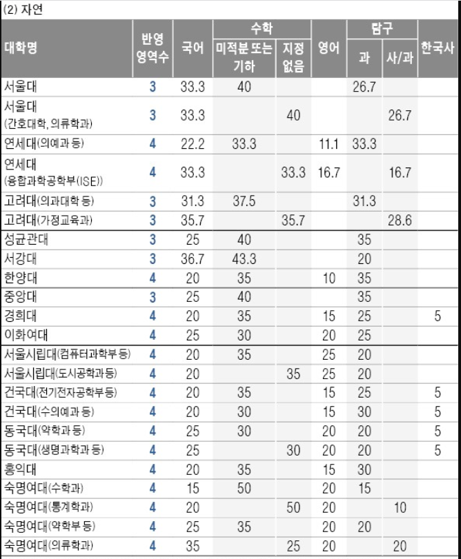 주요대학 수능 반영비율에 대하여 알아보겠습니다. 서울대는 전계열에서 수학을 40% 반영하며 비중이 높습니다. 자연계열은 미적분, 기하 필수입니다. 주요대학 인문계열에서 수학의 비중은 높은 편입니다. 성균관대, 한양대(파이낸스경영), 중앙대 사회과학대학, 공공인재학부는 40%반영, 중앙대 경영경제 대학은 45%를 반영합니다. 서강대는 인문계 전 학과 43.3%를 반영합니다. 주요대학에서는 이화여대, 경희대 영어영문학과, 건국대 미디어커뮤니케이션 전공, 동국대 경영경제, 숙명여대 등이 수학 25% 반영으로 그나마 낮은 편입니다. 연세대는 33.3%, 고려대는 35.7%를 반영합니다. 국어 과목으로 보면 서울대 33.3%, 연세대 33.3, 고려대 35.7, 성균관대 40, 서강대 36.7, 한양대 30, 중앙대 35~40, 경희대 25~35, 이화여대, 한국외국어대, 서울시립대, 건국대, 동국대, 홍익대 등이 30%를 반영합니다. 자연계열에서는 숙명여대 수학과가 수학 과목 50% 반영으로 가장 높습니다. 수학과목 반영 비율은 고려대 의과대학 37.5%, 연세대 의예 33.3%, 성균관대 40, 서강대 43.3, 한양대 35, 중앙대 40, 경희대 35, 이화여대 30, 서울시립대 35, 건국대 30~35, 동국대 25, 홍익대 20, 숙명여대 35~50입니다. 자연계열 국어 반영 비율은 표를 참고하시기 바라겠습니다.