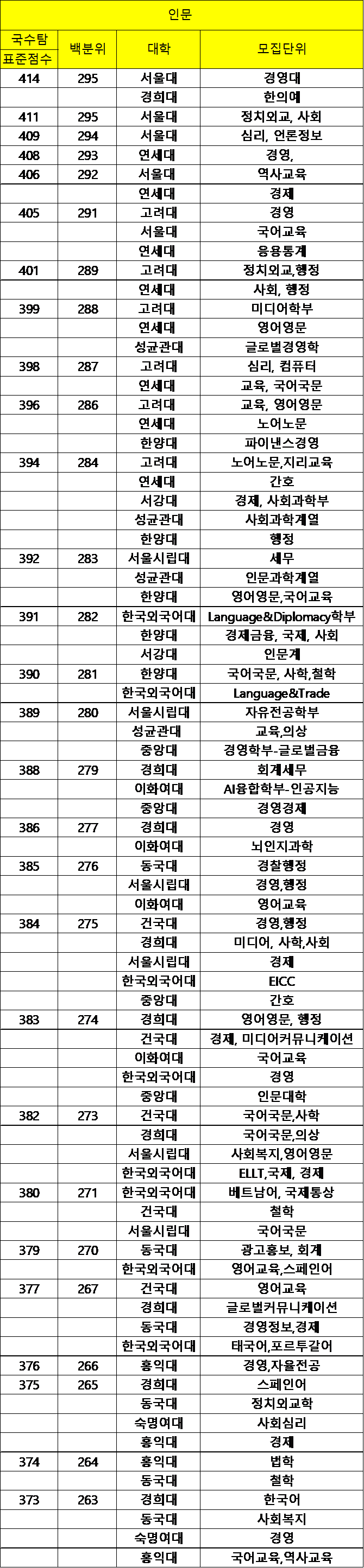 입시업체인 이투스에서는 실채점을 기준으로 정시배치표를 작성하였습니다. 다른 입시업체들의 정시배치표 예상점수도 크게 다르지는 않지만 다소 차이가 있으니 참고하시기 바랍니다. 인문계는 점수대가 낮아질 것으로 예상합니다. 표준점수 기준으로 서울대 경영대는 414점, 연세대 경영 408, 고려대 경영 405점으로 예상합니다. 서울대 국어교육 405, 고려대 정치외교, 행정 401, 연세대 사회, 행정 401점으로 400점을 넘겨야 지원이 가능할 것으로 보고 있습니다. 주요대학 인문계 상위권 학과 지원 점수대를 보면 성균관대 글로벌경영학 399, 한양대 파이내스경영 396, 서강대 경제, 사회학부 394, 한양대 행정 394, 서울시립대 세무 392, 한국외국어대 Language&Diplomacy학부 391, 중앙대 경영학부-글로벌금융 389, 경희대 회계세무 388, 이화여대 AI융합학부-인공지능, 동국대 경찰행정 385, 건국대 경영, 행정 384, 홍익대 경영 376점 등으로 예상합니다.